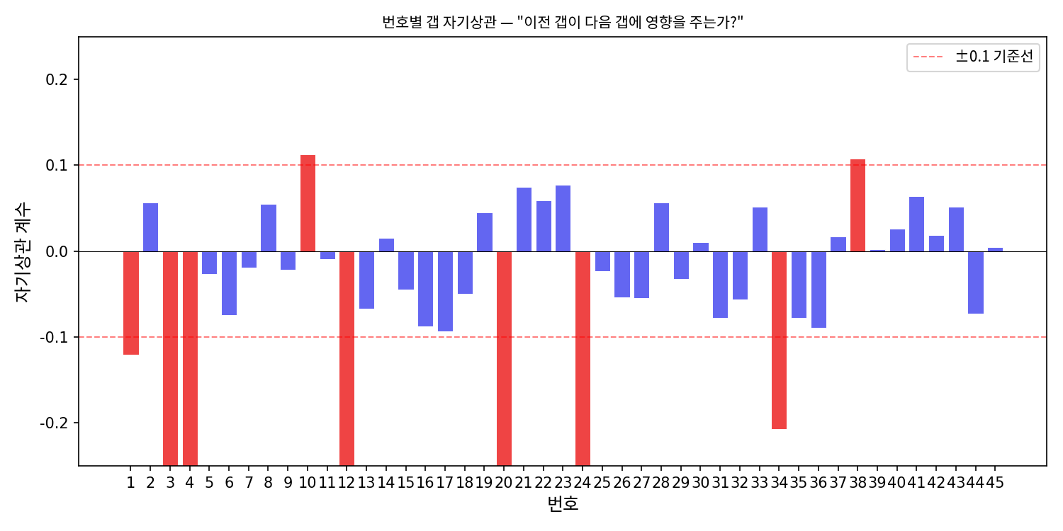 45개 번호의 자기상관을 차트로 그려봤다. 빨간 점선이 ±0.1 기준선인데, 대부분 이 안에 들어온다.
