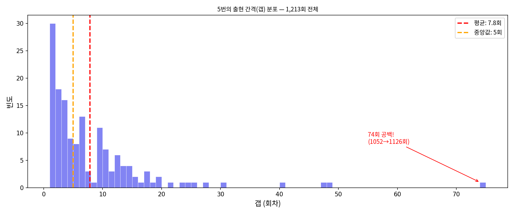 갭 1~3회(금방 또 나옴)가 전체의 42%. 대부분 금방 다시 나온다. 하지만 가끔, 아주 가끔, 74회처럼 극단적인 공백이 있다.