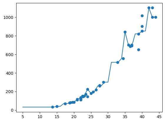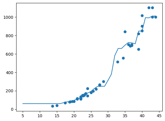 x = np.arange(5, 45).reshape(-1, 1)