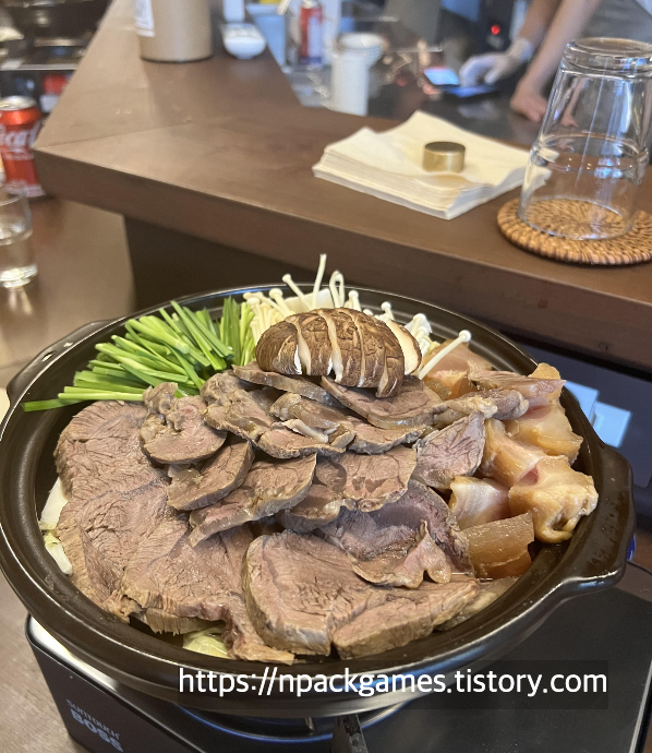 목로 너머로는 사장님이 '아롱사태 스지 전골'을 전골 냄비에 담고 있다. 주변 테이블에도 전골 냄비가 하나씩 있는 것으로 보아 인기 메뉴인 듯하다. 한두잔 마시다 보니 전골이 나왔다.