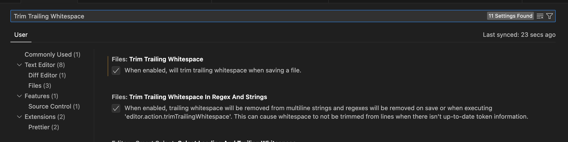 검색창에 'Trim Trailing Whitespace'를 검색해서 Check